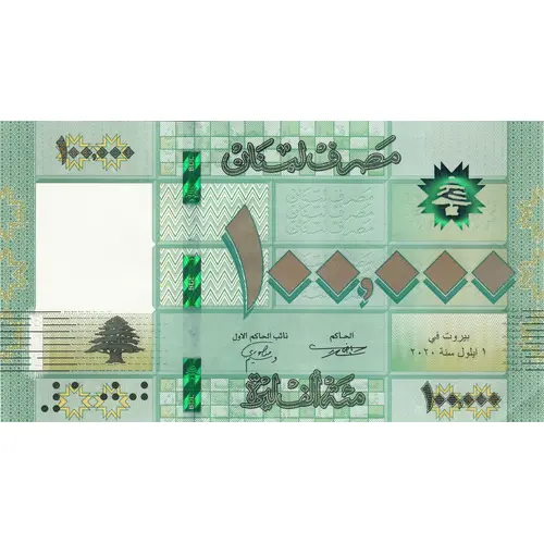 | Arka yüz lejandı | BANQUE DU LIBAN CENT MILLE LIVRES (Translation: Bank of Lebanon One Hundred Thousand Pounds) |
