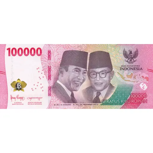 | Obverse lettering | 100000 NEGARA KESATUAN REPUBLIK INDONESIA GUBERNUR BANK INDONESIA MENTERI KEUANGAN REPUBLIK INDONESIA Dr. (H.C.) Ir. SOEKARNO Dr. (H.C.) Drs. MOHAMMAD HATTA 100000 SERATUS RIBU RUPIAH (Translation: The Unitary State of the Republic of Indonesia Governor of the Bank of Indonesia Minister of Finance of the Republic of Indonesia One hundred thousand Rupiah) |