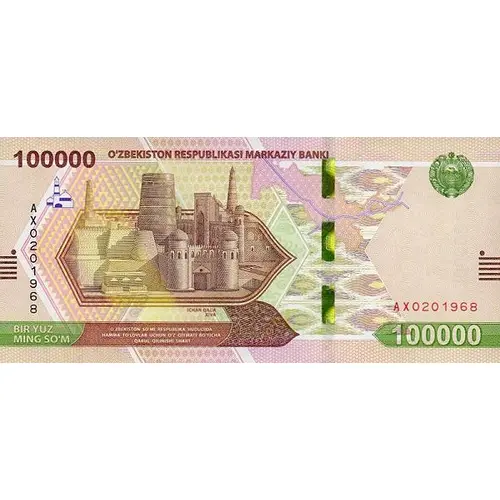 | Opschrift keerzijde | OʻZBEKISTON RESPUBLIKASI MARKAZIY BANKI BIR YUZ MING SOʻM 100000 OʻZBEKISTON SOʻMINI QALBAKILASHTIRISH QONUNGA MUVOFIQ TAʼQIB QILINADI 100000 (Translation: Central Bank of the Republic of Uzbekistan, One Hundred Thousand So‘m, Counterfeiting of the Uzbek so‘m is prosecuted in accordance to the law) |