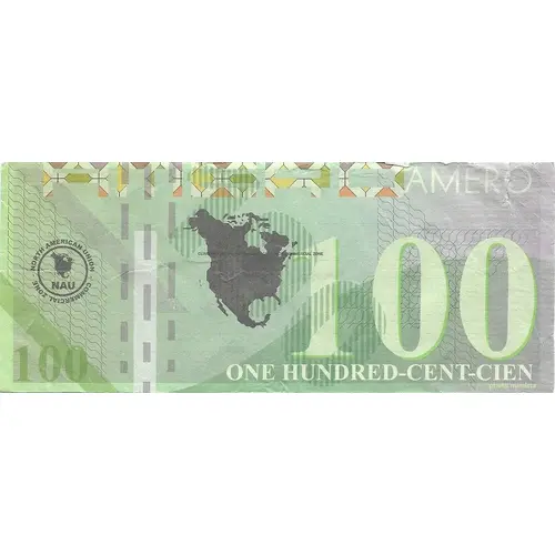 | Arka yüz lejandı | USA CAN MEX NAU CURRENCY OF THE NORTH AMERICAN UNION COMMERCIAL ZONE 100 AMERO |