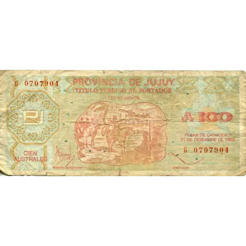 | Obverse lettering | PROVINCIA DE JUJUY TITULO PUBLICO AL PORTADOR LEY No 4434/89 PJ A100 FECHA DE CADUCIDAD 31 DE DICIEMBRE DE 1989 CIEN AUSTRALES (Translation: Province of Jujuy Bearer public bond Law 4434/89 Expiry date Dec. 31, 1989 One hundred Australes) |
