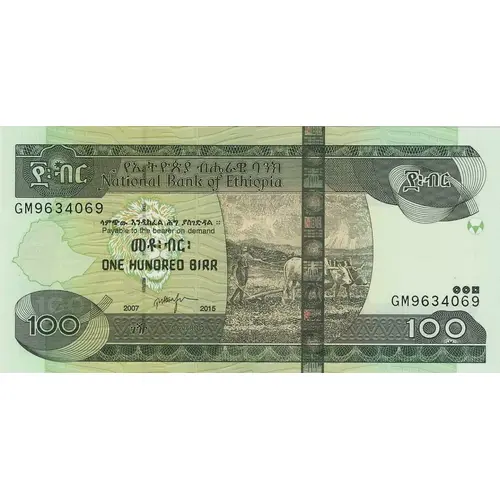 | Obverse lettering | ፻፡ብር የኢትዮጵያ ብሔራዊ ባንክ National Bank of Ethiopia ላምጪው፡አንዴከፈል፡ሕግ፡ያሰገዽዷል። Payable to bearer on demand መቶ፡ብር፡ ONE HUNDRED BIRR (Translation: 100 Birr National Bank of Ethiopia Payable to bearer on demand Hundred Birr) |