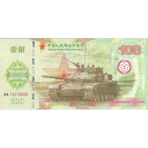 | Obverse description | Type 99/ZTZ-99 main battle tank with crew. Large five-pointed star in the background. Denomination 100 at the top right. Security-style flower with 1893-2023 at left. Serial number at lower left. |
