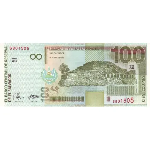 | Legenda awersu | EL BANCO CENTRAL DE RESERVA DE EL SALVADOR SERIE AG 100 PAGARA EN EFECTIVO AL PORTADOR SAN SALVADOR 19 DE ABRIL DE 1999 100 SERIE AG CIEN COLONES |