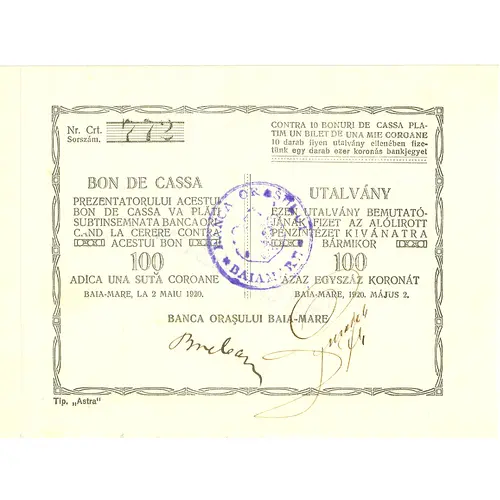 CONTRA 10 BONURI DE CASSA PLA- TIM UN BILET DE UNA MIE COROANE 10 darab ilyen utalvány ellenében fize- tünk egy darab ezer koronás bankjegyet BON DE CASSA PREZENTATORULUI ACESTUI BON DE CASSA VA PLĂTI SUBTINSEMNATA BANCA ORI CÂND LA CERERE CONTRA ACESTUI BON 100 ADICA UNA SUTĂ COROANE BAIA/MARE, LA 2 MAIU 1920. UTALVÁNY EZEN UTALVÁNY BEMUTATÓ- JÁNAK FIZET AZ ALÓLIROTT PÉNZINTÉZET KIVÁNATRA BÁRMIKOR 100 AZAZ EGYSZÁZ KORONÁT BAIA/MARE, 1920. MÁJUS 2. BANCA ORAȘULUI BAIA-MARE Tip. ”Astra” |