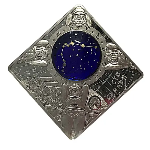 The image of the star atlas “Firmamentum Sobiescianum” created at the end of the XVII century by Johannes Hevelius, with an image of Aquarius constellation on the cobalt glass insert, and a symbol of Aquarius zodiac sign on the top of the coin. |