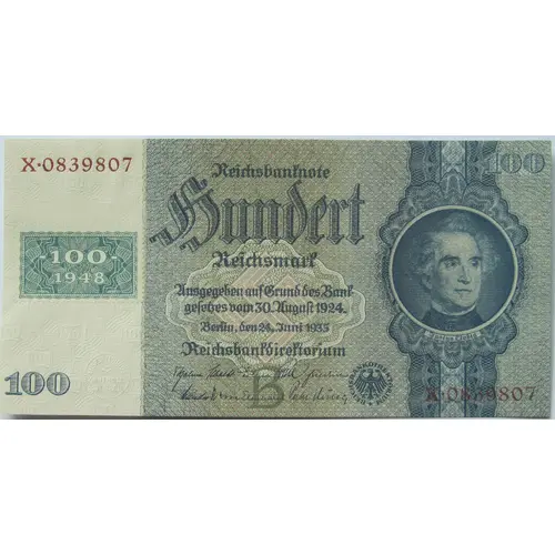 100 Reichsbanksnote Hundert Reichsmark - 100 - 1948 Ausgegeben auf Grund des Bankgesetzes vom 30. August 1924. Berlin, den 24. Juni 1935 Reichsbankdirektorium 100 Justus von Liebig |