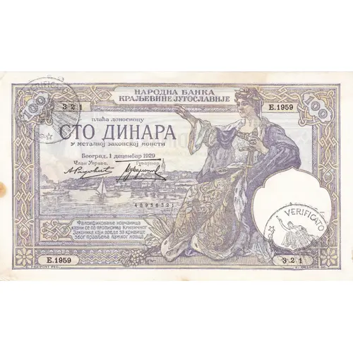 | Légende de l’avers | НАРОДНА БАНКА КРАЉЕВИНЕ ЈУГОСЛАВИЈЕ плаћа доносиоцу СТО ДИНАРА у металној законској монети Београд, 1. децембар 1929 Фалсификовање новчаница казни се по прописима Кривичног Законика који вреде за кривице због прављења лажног новца VERIFICATO G. FRAIPONT FEC. E. DELOCHE SC. (Translation: NATIONAL BANK OF THE KINGDOM OF YUGOSLAVIA pays the bearer ONE HUNDRED DINARS in metallic legal tender Belgrade, December 1, 1929 Forgery of banknotes shall be punished according to the regulations of the Criminal Code that are valid for crimes for making fake money VERIFIED) |