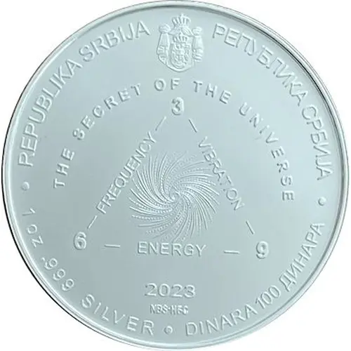 REPUBLIKA SRBIJA РЕПУБЛИКА СРБИЈА THE SECRET OF THE UNIVERSE 3 6 9 FREQUENCY VIBRATION ENERGY 2023 NBS-НБС 1 OZ .999 SILVER DINARA 100 ДИНАРА (Translation: Republic of Serbia) |