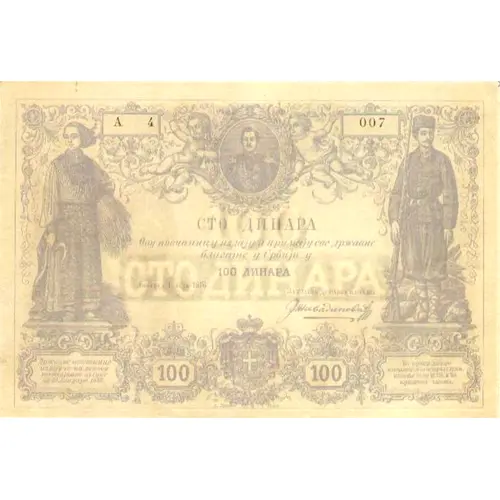 СТО ДИНАРА Ову новчаницу издају и примају све државне благајне у Србији у 100 ДИНАРА Државне новчанице издају се на основу законодавне одлуке од 19. Јануара 1876 Ко прави лажне новчанице, и ко се њима служи, казниће се по §§ 145 и 146. кривичног закона. |