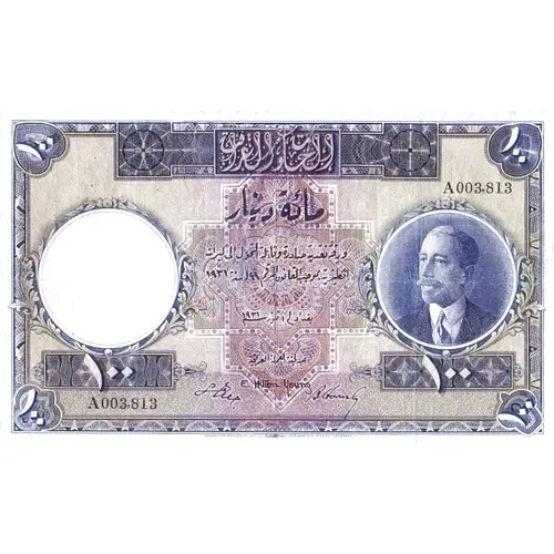 Rückseitenlegende GOVERNMENT OF IRAQ ONE HUNDRED DINARS CURRENCY NOTE ISSUED AND CONVERTIBLE INTO STERLING, IN ACCORDANCE WITH THE PROVISIONS OF LAW NO 44 OF 1931 BAGHDAD FOR THE IRAQ CURRENCY BOARD