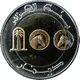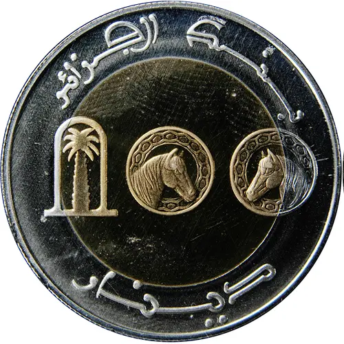| Obverse description | The face value is written with a palm tree for the number 1, the obverse of the coin for the first 0 and its symmetry for the second 0. It is surrounded with the Arabic inscription `Bank of Algeria` (on top) and `dinars` (underneath) and two stars. The palm tree is inscribed inside a pattern shaped like a door from the southern Algeria. |