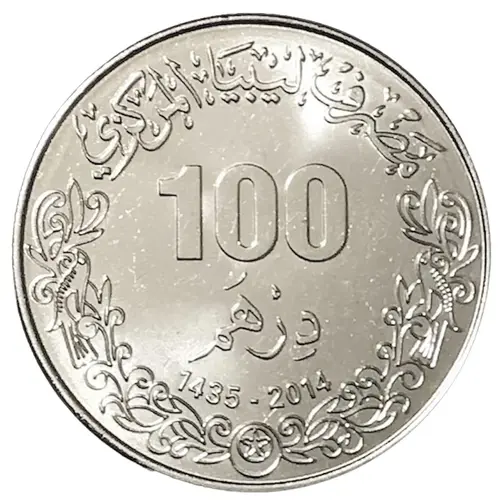 | نوشتههای روی سکه | مصرف ليبيا المركزي 100 درهم 1435 - 2014 (Translation: Central Bank of Libya 100 Dirham) |