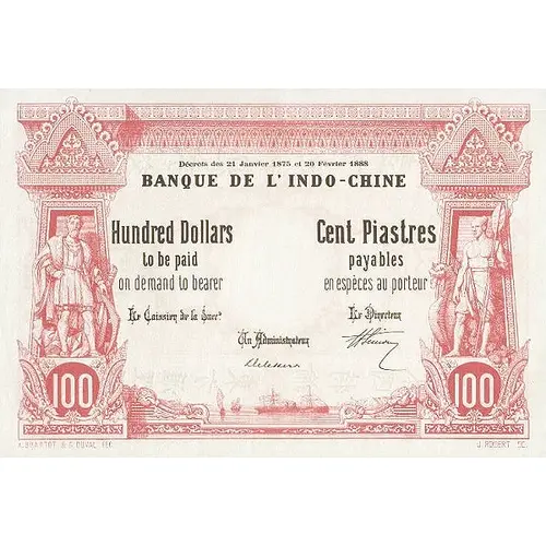 | نوشتههای روی اسکناس | BANQUE DE L`INDO-CHINE ONE HUNDRED DOLLARS CENT PIASTRES TO BE PAID ON DEMAND TO BEARER PAYABLES EN ESPÈCES AU PORTEUR A. BRAMTOT & G. DUVAL FEC. J. ROBERT SC. |