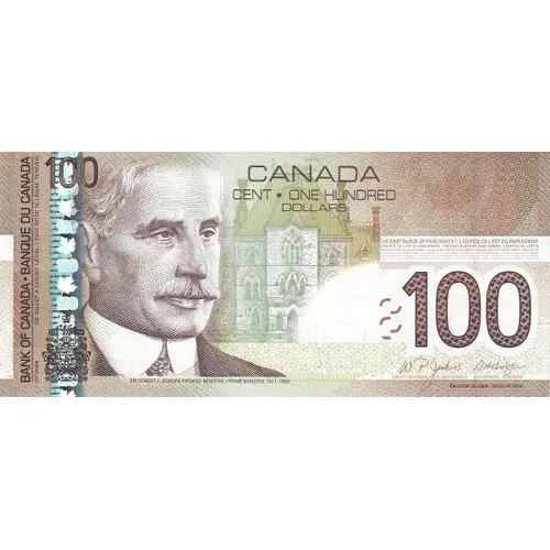 BANK OF CANADA · BANQUE DU CANADA OTTAWA CE BILLET A COURS LEGAL / THIS NOTE IS LEGAL TENDER 100 CANADA CENT · ONE HUNDRED DOLLARS THE EAST BLOCK OF PARLIAMENT · L`EDIFICE DE L`EST DU PARLEMENT 100 DEPUTY GOVERNOR SOUS-GOUVERNEUR GOUVERNEUR GOVERNOR SIR ROBERT L. BORDEN MINISTRE / PRIME MINISTER 1911-1920 EMISSION DE 2004 / ISSUE OF 2004 |