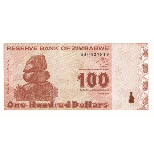 | Obverse lettering | RESERVE BANK OF ZIMBABWE I promise to pay the bearer on demand 100 for the Reserve Bank of Zimbabwe Harare 2009 One Hundred Dollars |