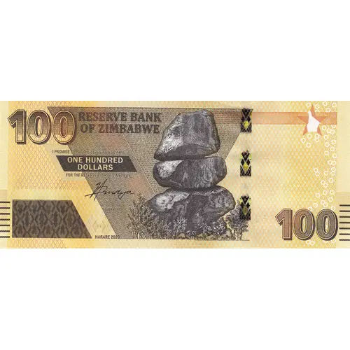100 RESERVE BANK OF ZIMBABWE I PROMISE TO PAY THE BEARER ON DEMAND ONE HUNDRED DOLLARS FOR THE RESERVE BANK OF ZIMBABWE HARARE 2020 |