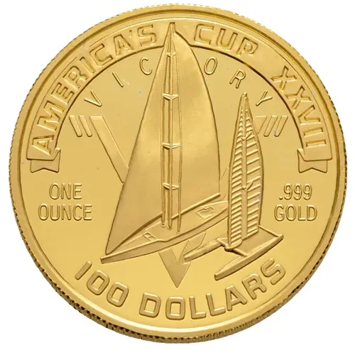 | Obverse lettering | AMERICA`S CUP XXVII VICTORY ONE .999 OUNCE GOLD 100 DOLLARS |
