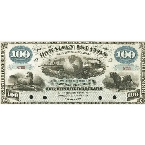 | Надписи лицевой стороны | CERTIFICATE OF DEPOSIT DEPARTMENT OF FINANCE HAWAIIAN ISLANDS THIS CERTIFIES THAT there have been deposited at the HAWAIIAN TREASURY ONE HUNDRED DOLLARS IN SILVER COIN payable to the bearer ON DEMAND |