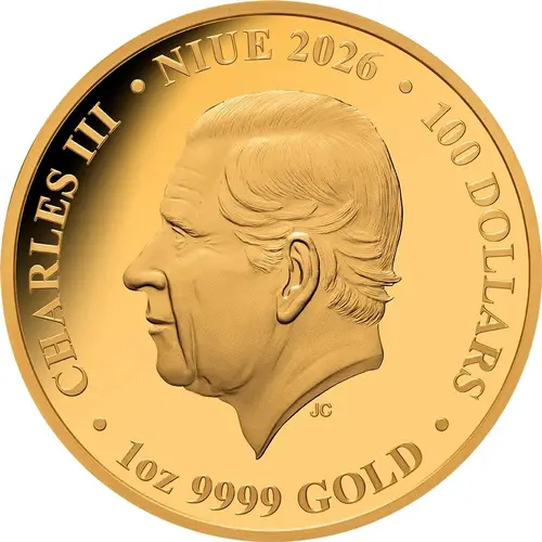 | Obverse lettering | CHARLES III · NIUE 2026 · 100 DOLLARS JC · 1oz 9999 GOLD · |