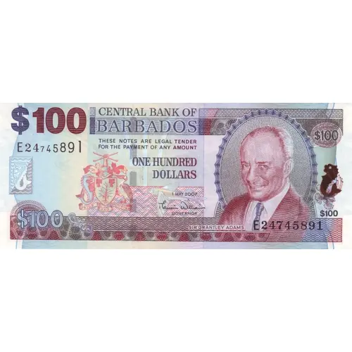 CENTRAL BANK OF BARBADOS THESE NOTES ARE LEGAL TENDER FOR THE PAYMENT OF ANY AMOUNT ONE HUNDRED DOLLARS GOVERNOR SIR GRANTLEY ADAMS PRIDE AND INDUSTRY $100 1 MAY 2007 |