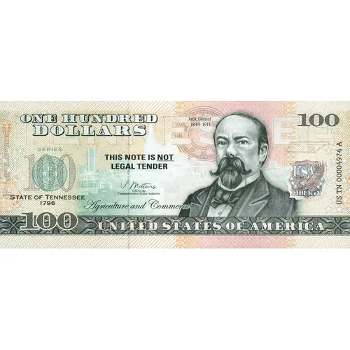 ONE HUNDRED DOLLARS SERIES STATE OF TENNESSEE 1796 100 THIS NOTE IS NOT LEGAL TENDER Agriculture and Commerce Jack Daniel 1849–1911 100 UNITED STATES OF AMERICA |