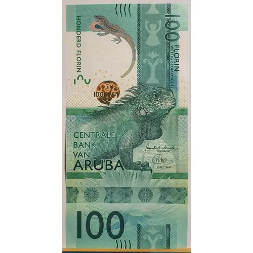 | Opis líce | 100 FLORIN WETTIG BETAALMIDDEL HONDERD FLORIN CENTRALE BANK VAN ARUBA 100 (Translation: 100 Florin Legal Tender One Hundred Florin Central Bank of Aruba 100) |