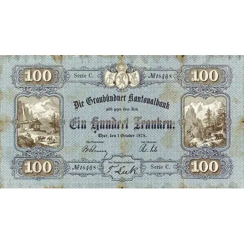 | 正面铭文 | 100 100 Die Graubündner Kantonalbank zahlt gegen diese Note Ein Hundert Franken Chur den 1. October 1878 Der Präsident: Der Director: 100 Der Standesbuchhalter: 100 |