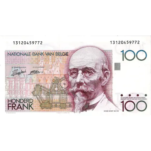 | نوشتههای روی اسکناس | NATIONALE BANK VAN BELGIE HONDERD FRANK 100 DE NAMAKER WORDT MET DWANGARBEID GESTRAFT (ART. 173 VAN HET STRAFWETBOEK) HENDRIK BEYAERT 1823-1894 C. LECLERCQZ SC. Y. ADAM - M. HÜRRIG INV. (Translation: National Bank of Belgium One Hundred Francs Counterfeiters will be punished (art. 173 of the penal code)) |