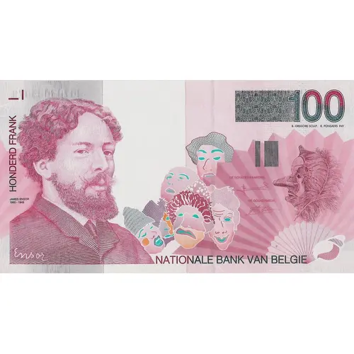 | Leyenda del anverso | HONDERD FRANK JAMES ENSOR 1860-1949 100 B. GREGOIRE SCULP. K. PONSAERS INV. NATIONALE BANK VAN BELGIE (Translation: One Hundred Francs National Bank of Belgium) |