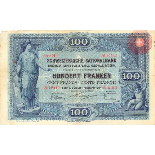 100 SCHWEIZERISCHE NATIONALBANK BANQUE NATIONALE SUISSE • BANCA NATIONALE SVIZZERA (GESETZ VOM 6. OKTOBER 1905) HUNDERT FRANKEN CENT FRANCS • CENTO FRANCHI 50 BERN & ZÜRICH, 1.FEBRUAR 1907 DER PRÄSIDENT DES BANKRATES: DER HAUPTKASSIER: EIN MITFLIED DES DIREKTORIUMS: 100 BRADBURY, WILKINSON & CO LONDRES. |