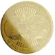 Obverse and reverse of a 20 dollars gold coin. Torch at top, beaded circle around the rim. |