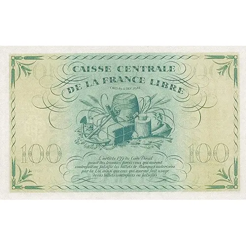 | Obverse lettering | CAISSE CENTRALE DE LA FRANCE LIBRE CENT FRANCS EDMUND DULAC DEL. (Translation: Central Fund of Free France Hundred Francs) |