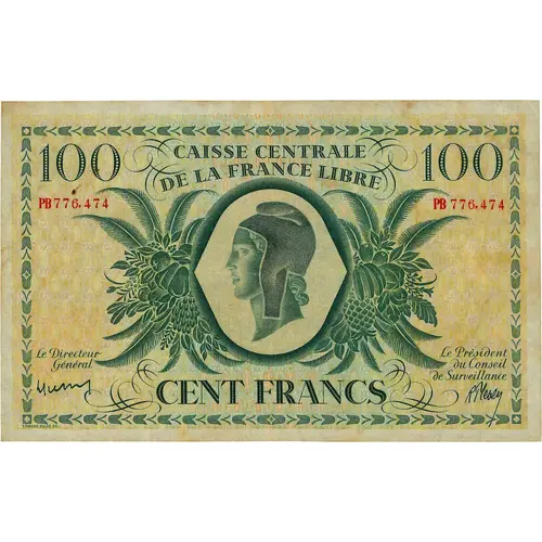 | 表面の銘文 | CAISSE CENTRALE DE LA FRANCE LIBRE CENT FRANCS EDMUND DULAC DEL. |