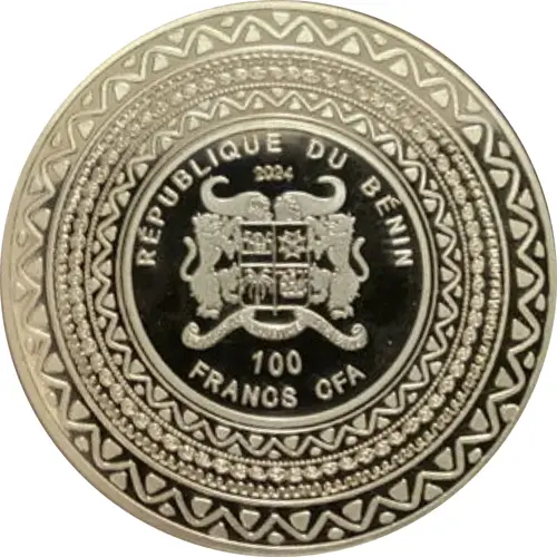 | Opis líce | REPUBLIQUE DU BENIN 2024 FRATERNITE JUSTICE TRAVAIL 100 FRANCS CFA (Translation: Republic of Benin Brotherhood Justice Work) |