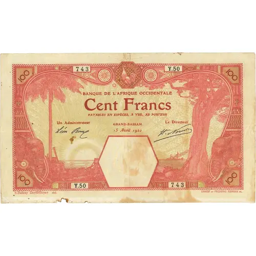 | Leyenda del anverso | BANQUE DE L`AFRIQUE OCCIDENTALE CENT FRANCS PAYABLES EN ESPÈCES, A VUE, AU PORTEUR GRAND-BASSAM h.Bellery Desfontaines del. ERNEST ET FREDERIC FLORIAN SC. |