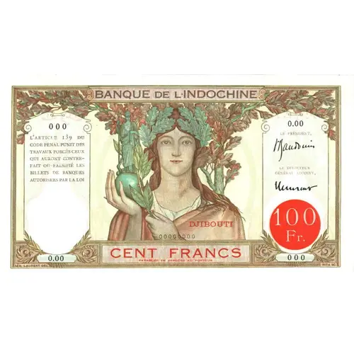 Obverse lettering BANQUE DE L`INDO-CHINE CENT FRANCS PAYABLES EN ESPÈCES AU PORTEUR L`ARTICLE 139 DU CODE PENAL PUNIT DES TRAVAUX FORCÈS CEUX QUI AURONT CONTREFAIT OU FALSIFIÉ LES BILLETS DE BANQUE AUTORISÉE PAR LA LOI LE PRESIDÉNT LE DIRECTEUR GÉNÉRAL DJIBOUTI 100 Fr. SÉB. LAURENT DEL RITA SC