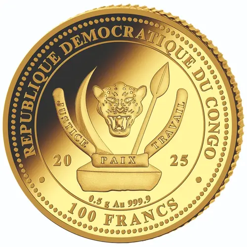 | Légende de l’avers | REPUBLIQUE DEMOCRATIQUE DU CONGO JUSTICE PAIX TRAVAIL 2025 0.5 g Au 999.9 100 FRANCS (Translation: Democratic Republic of the Congo Justice Peace Work) |