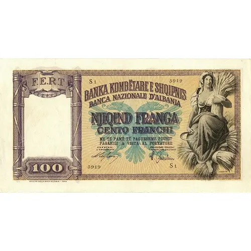 | Ön yüz lejandı | BANKA KOMBËTARE E SHQIPNIS BANCA NAZIONALE D`ALBANIA NJIQIND FRANGA CENTO FRANCHI ME TË PAMË TË PAGUESHME PRUSIT PAGABILI AL VISTA AL PORTATORE (Translation: NATIONAL BANK OF ALBANIA ONE HUNDRED FRANCS PAYABLE TO THE BEARER ON DEMAND) |