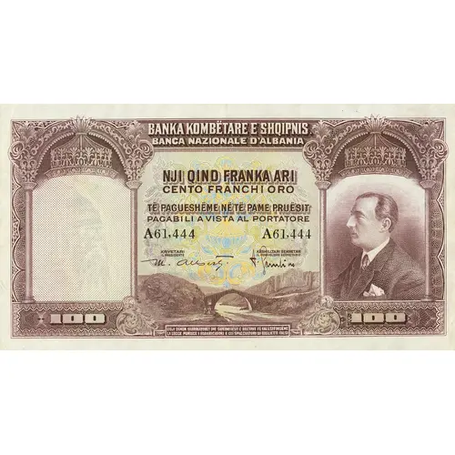 | 表面の銘文 | BANKA KOMBËTARE E SHQIPNIS BANCA NAZIONALE D`ALBANIA NJI QIND FRANKA ARI CENTO FRANCHI ORO TË PAGUESHËME NË TË PAME PRUËSIT PAGABILI AL VISTA AL PORTATORE (Translation: National Bank of Albania One Hundred Gold Francs Payable to the bearer) |