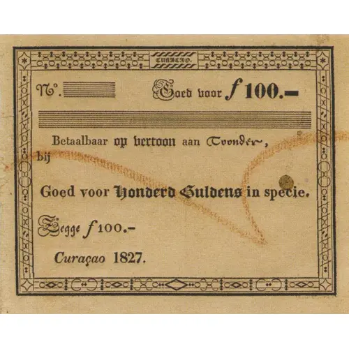 | Obverse lettering | CURAÇAO Goed voor f 100 Honderd Gulden Betaalbaar op vertoon aan Toonder bij Goed voor HORDERD GULDEN in Specie. Zegge f 100 Curaçao 1827. (Translation: Curaçao Good for f 100 Hundred Gulden. Payable on presentation to bearer Good for Hundred Gulden Say 100 Curaçao 1827.) |