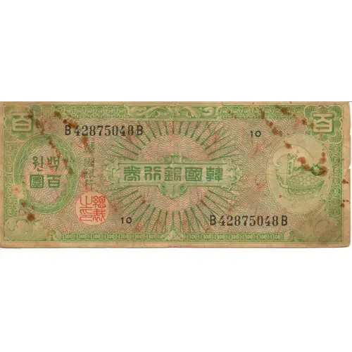 | Reverse lettering | The BANK of KOREA 圜百 백 원 ONE HUNDRED WON (Translation: One Hundred Hwan, One Hundred Won) |