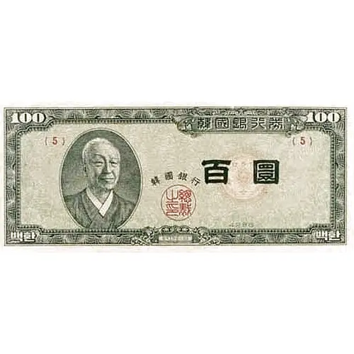 | Reverse lettering | The BANK OF KOREA 百 백 圜 환 ONE HUNDRED HWAN (Translation: One Hundred Hwan) |