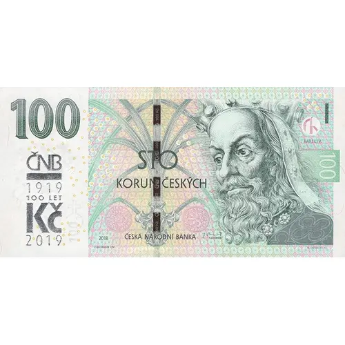 | 表面の銘文 | STO Korun Českých Karel IV. Česká Národní Banka ČNB 1919 100 LET Kč 2019 O. KULHÁNEK INV. M. ONDRÁČEK SC. (Translation: One Hundred Czech Crowns.) |