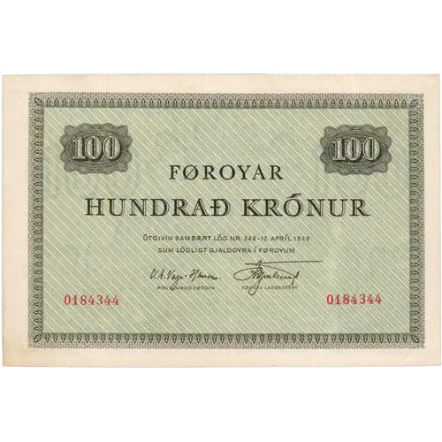 | Obverse lettering | 100 100 FØROYAR HUNDRAÐ KRÓNUR ÚTGIVIN SAMBÆRT LÓG NR. 248 - 12. APRÍL 1949. SUM LÓGLIGT GJALDOYRA Í FØROYUM. |