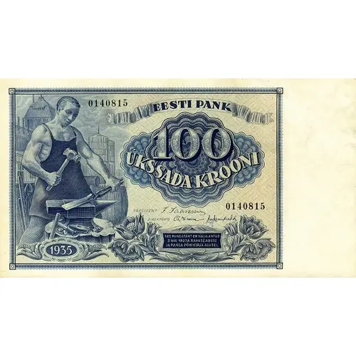 | Obverse lettering | EESTI PANK 100 ÜKSSADA KROONI 1935 SEE PÄNGATÄHT ON VÄLJA ANTUD 3 MAI 1927 A. RAHASEADUSE JA PANGA PÕHIKIRJA ALUSEL (Translation: Bank of Estonia Hundred Krooni This banknote was issued under the Money Act of May 3rd 1927 and the bank`s statutes.) |