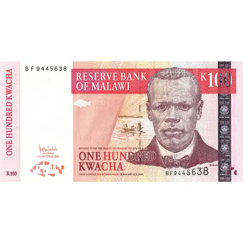 | Opis líce | RESERVE BANK OF MALAWI PROMISE TO PAY THE BEARER ON DEMAND THE SUM OF K100 ONE HUNDRED KWACHA ISSUED UNDER THE RESERVE BANK OF MALAWI ACT, 1989 |