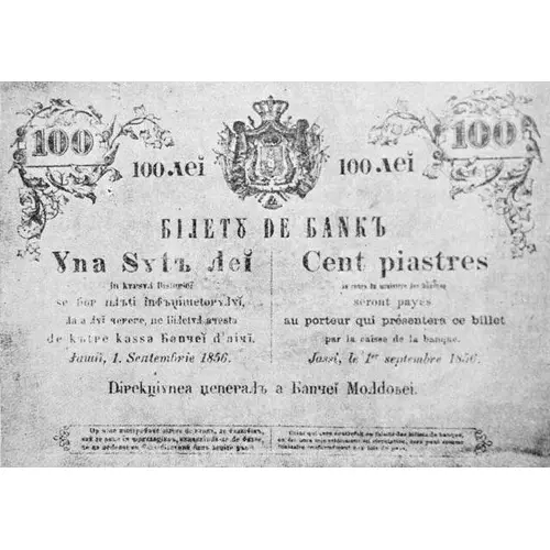 100 Лei 100 Лei БІLETꙊ DE БАNКЪ Ꙋna Sꙋtъ Лei | Cent piastres лa кꙋpsꙋl bistiepiei | au cours du ministére de finances se вoр пlъti înfъцшetoрꙋlꙋ | seront payés лa a лꙋi чеpepe, пe Бiletꙋl aчesta | au porteur qui présentera ce billet de kъtpe cassa Бъnчі d`aici | par la caisse de la banque Iaшi, 1 seпtemБpie 1856 | Jassi, le I-er septembre 1856 Dipeкцiꙋnea гenepaлъ a Бъnчii Moлdoвei. прesкpiпцiiлe apt. 13 прiвitoape ла фaлsiфiкatoрi Op чine кontпaфaчe Бiлete de Бanкъ,лe фaлsiфiкъ | Celui qui aura contrefait ou falsifié saꙋ лe пꙋne ꙟn чiркꙋлaцie,кꙋnosкꙟndꙋ-se de фieчe | des billets de banque ou les sera mis aciement en circulation se вa пedeпsi кa фaлsiфiкatopꙋ dꙋпъ лeџілe цъpii. | serra puni comme fausseur conforment les lois du pays. (Translation: 100 Lei 100 Lei BANKNOTE 100 Lei At the treasury rate will be paid to the bearer at his request, on this note by the bank office here in Iasi, September 1, 1856 General Directorate of the Bank of Moldova the prescriptions of article 13 regarding counterfeiters Anyone who counterfeits or falsifies bank notes or puts them into circulation will be punished as a counterfeiter in accordance with the laws of the country.) |