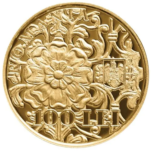 A door detail at the entrance to the church of Antim Monastery, the inscription “ROMANIA” in an arc, the coat of arms of Romania, the year of issue “2025” and the face value “100 LEI”. |