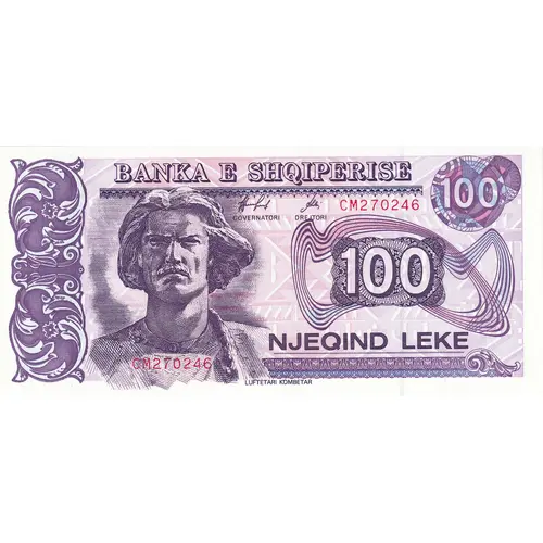 | Opschrift keerzijde | BANKA E SHQIPERISE NJEQIND LEKE (Translation: Bank of Albania 100 Leke) |